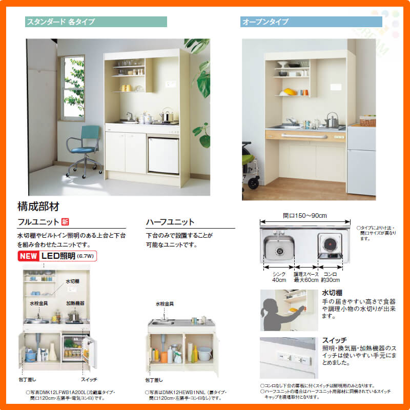 LIXIL ミニキッチン フルユニット 冷蔵庫タイプ(冷蔵庫付) 間口120cm ガスコンロ DMK12LFWB(1/2)D◆(R/L)