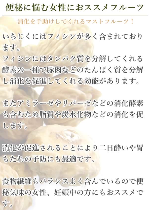 商品説明 ポイント ドライフルーツにする事で甘みと栄養がギューっと濃縮しました! 独特な食感はハマります! いちじく本来の甘さがしっかりと伝わるのでイチジク嫌いな方にも食べやすい!! 女性には嬉しい食物繊維がたっぷりなのも嬉しい♪